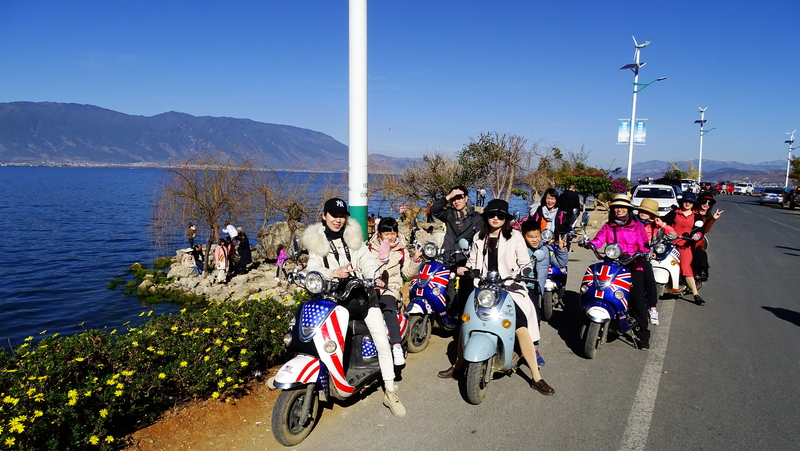 六辆电动摩托车沿着湖畔慢慢骑行,一站一站“打卡”游玩。