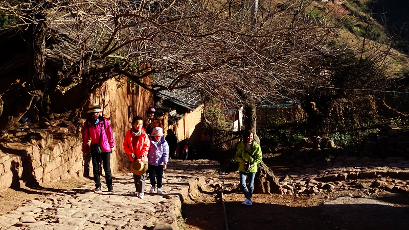 在马铃声中,我们走进了这个千年白族村,一眼望见,依山而建,错落有致,黛檐红墙的明清建筑群。一条河从村庄前蜿蜒远去。一棵高高的古榕立在半山坡,在金色阳光下,镀上一层历史的韵味。