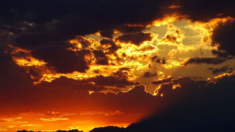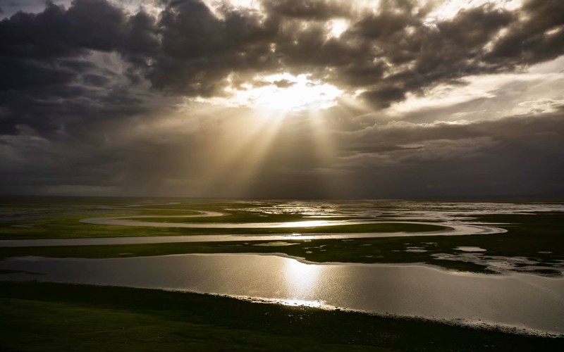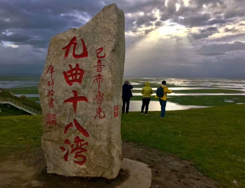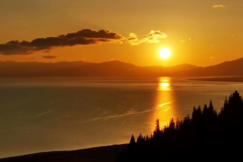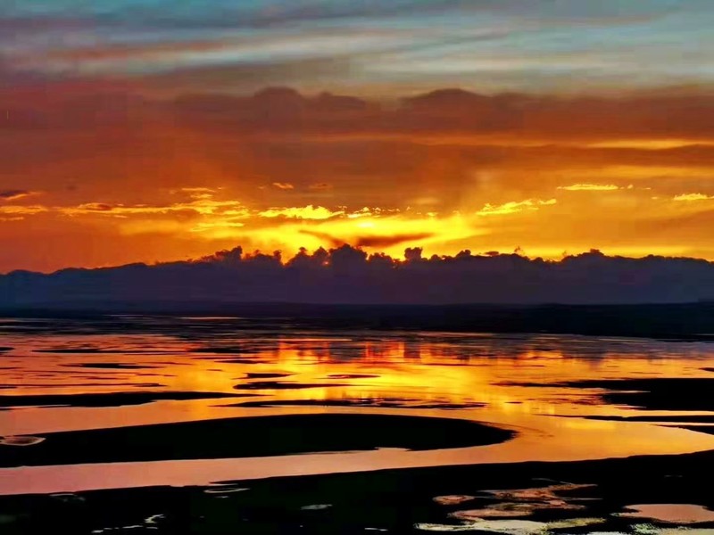 从天边而来的开都河,在眼前蜿蜒铺就。我的目力所及,想把九曲十八弯细数,却是枉然。慕名而来的人们,密密挨挨,挤满栈道,等待黄昏,等待日落,等待九个太阳的奇迹。在漫天的乌云中,太阳偶尔从云缝中透出一点点希望之光,继而又掩于厚厚的云层中。我们在等待中心焦,在心焦中等待……21点,21点30分,时间一点一点流逝,乌云一层一层加厚,眼看大雨在即,无奈下山。到服务区,我不甘,回头,西望,瞬间,奇迹出现——我有幸见到此生最磅礴最灿烂的日落! 只见,落日挣脱沉重的乌云,从云缝泄出万道金光,世界失色,惟余霞光。 那奔泄而至的万道金箭,霎时击中,我的心脏。我不能呼吸,无法思考,定在那里,笼罩在一片金色里。大自然怎样的手笔呀,才能写就如此灿烂华章!