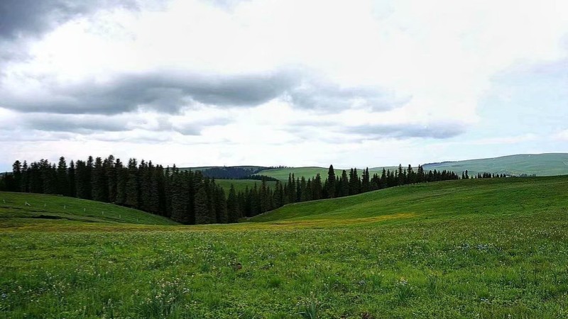 草原周遭,山峦起伏,弧线优美,与笔直的云杉林相映成趣;蓝天上不停变幻的白云,更为草原增添了几份神秘。大自然如此神奇,直叫人叹为观止。