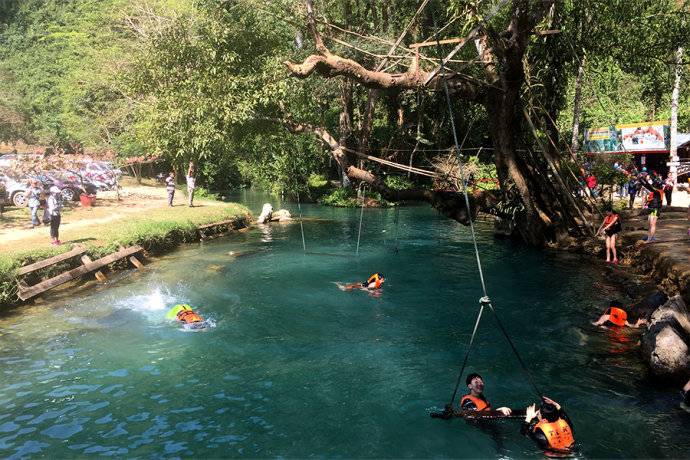 Blue Lagoon距离万荣市区往返只有7、8公里,如果你愿意挑战的话不妨租上一辆山地自行车穿行在充满诗意的乡间田园。这里是万荣最值得去的景点之一,“大树跳水”好玩又刺激。是一个天然的泳池,河旁边的一颗自然倾斜的大树就就是最好的跳水台,树上还绑了秋千和滑索。