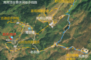 南湖村委(起点)-后湖-葫芦门古道-青架楼(午餐)-岚湖山茶园(午休点)-野花赏花徒步段-悬崖观景台-老茶园-前湖村(民居)-日落观景台--南湖村委(终点);