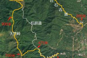 徒步起点200米-小化山大化山580/600米左右-最高900米-天竹岭山脊在850/700之间变化--山路终点480米左右-返程上车点200米。